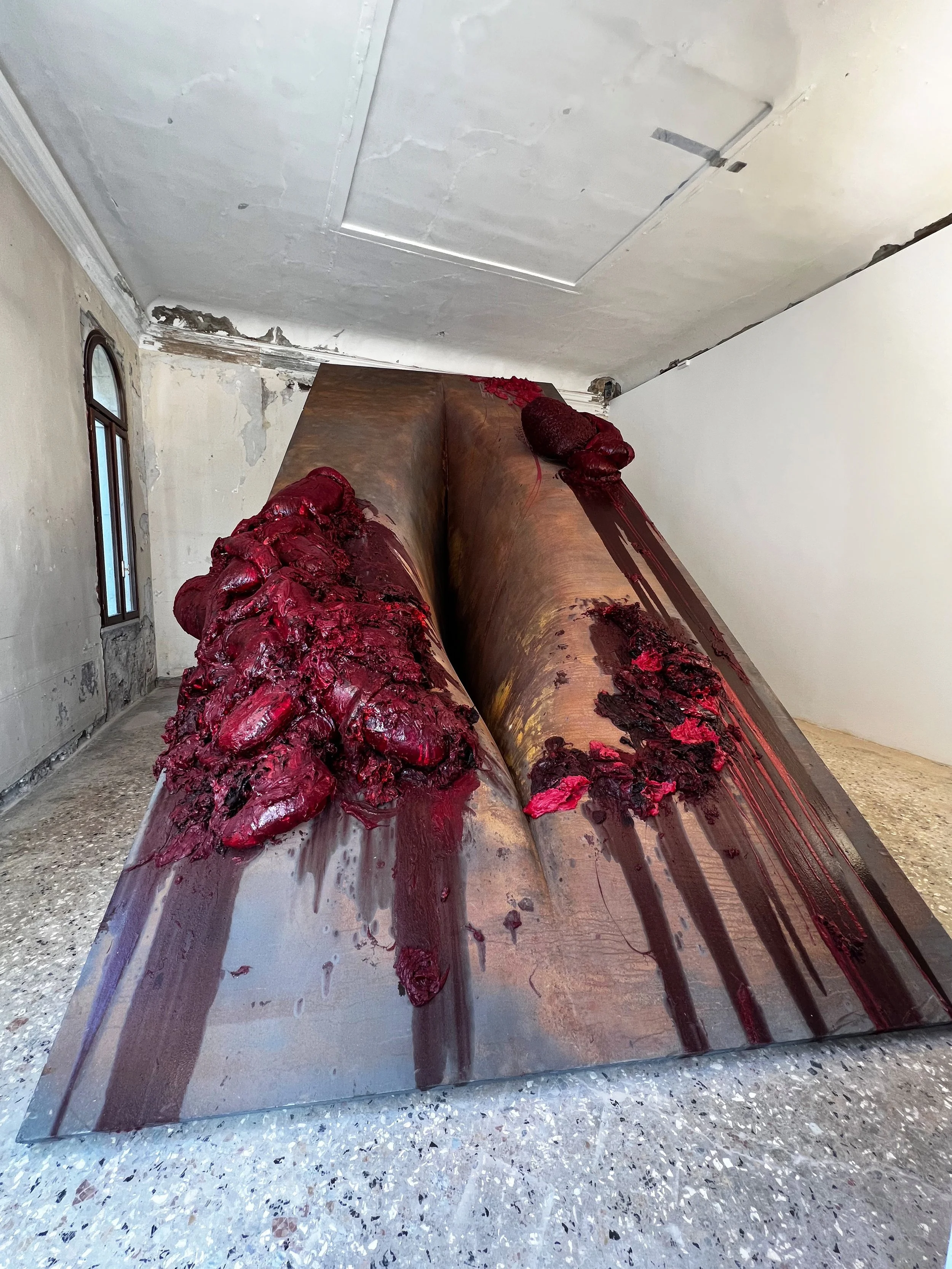 Coverage of the exhibition’s Palazzo Manfrin location can be seen in the video above and photography below. Guests are greeted by the enormous installation ‘Mount Moriah at the Gate of the Ghetto (2022)’, a gravity-defying mountain that descends from the ceiling, set against the backdrop of classical columns and stonework. Visitors are invited to explore a series of rooms that feature works from the artist’s career, including ‘Turning Water Into Mirror, Blood into Sky (2003)’ - a piece that ‘bends’ blood red liquid, creating a curved mirror that reflects the sky, ‘Destierro (2017) - tonnes of earth sprayed with a vivid red pigment appearing to be moved by a contrasting blue excavator intended to represent the displacement of people around the world.