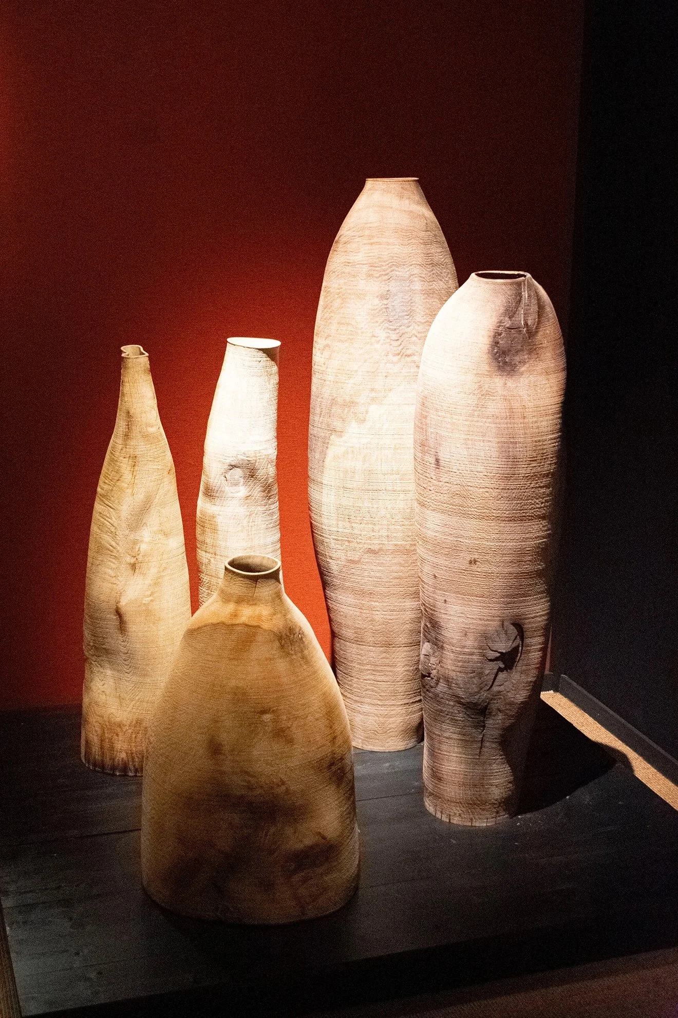 Other highlights presented by the gallery include the beautiful hand-carved wooden sculptural works by Alison Crowther, using materials sourced exclusively from UK woodlands. Tall wooden vessels stand at the entrance crafted by Ernst Gamperi, their unique forms created by turning the wood at its early green and supple stage. Finally, Eleanor Lakelin's fascinating objects, are dramatically lit on plinths to reveal the organic chaos of natural material by pulling back the layers of materials to expose the creation, decay and erosion of nature.