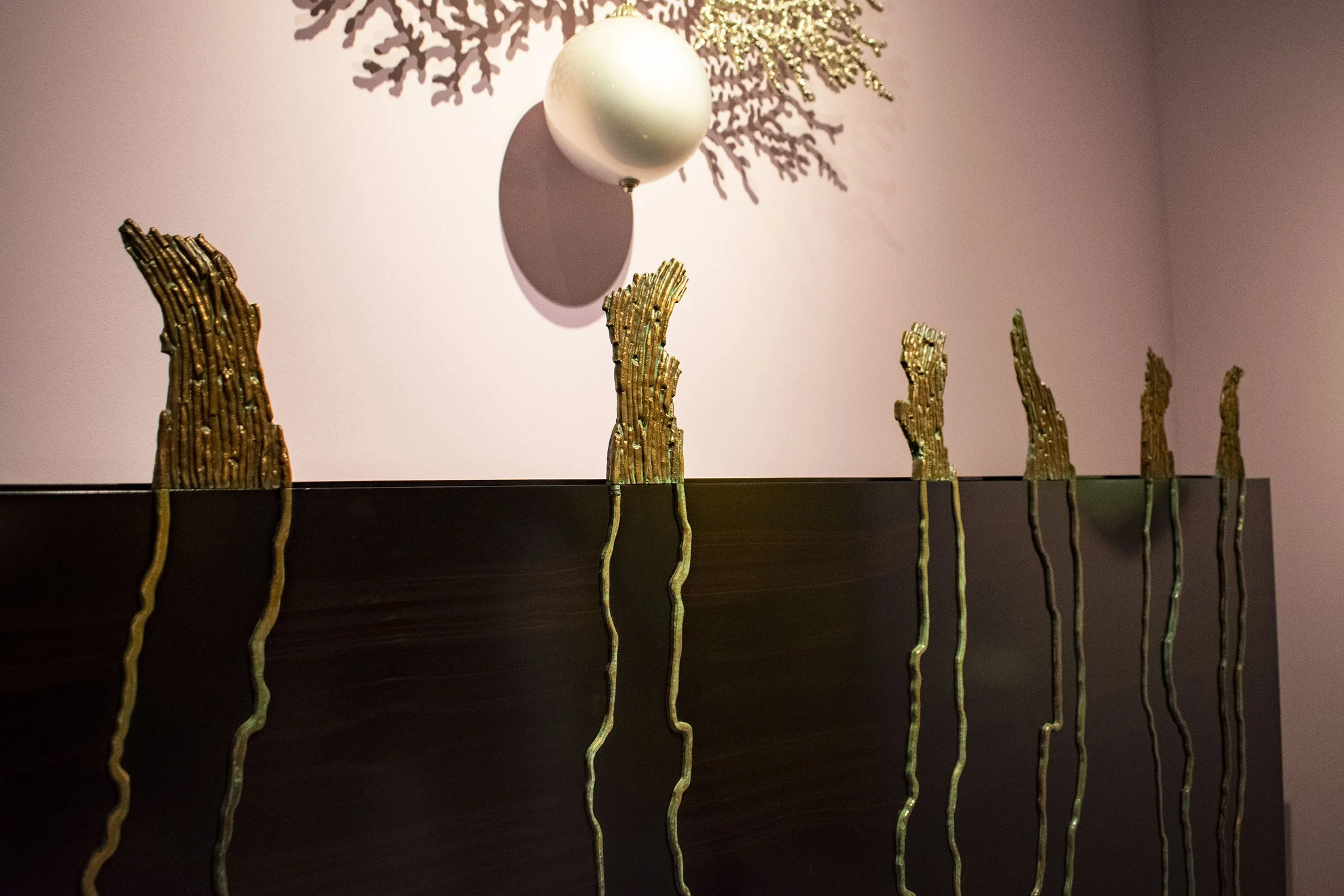 Creating a stand that was a piece of artwork in itself, Todd Merrill Studio introduced new collections of sculptural furniture, lighting and vessels from artists Brecht Wright Gander, Marc Fish, Jean-Luc Le Mounier and Markus Haase. Each with its distinctive looks and styles, the studio managed to provide something for everyone. Brecht Gander displayed a collection of captivating furniture and lighting designs that conceal their exact functions within an impressive form that resembles molten rock. Marc Fish's 'Etheral Desk' used new and innovative techniques to combine resin with his signature wood laminations to produce a desk that appears caught in motion.