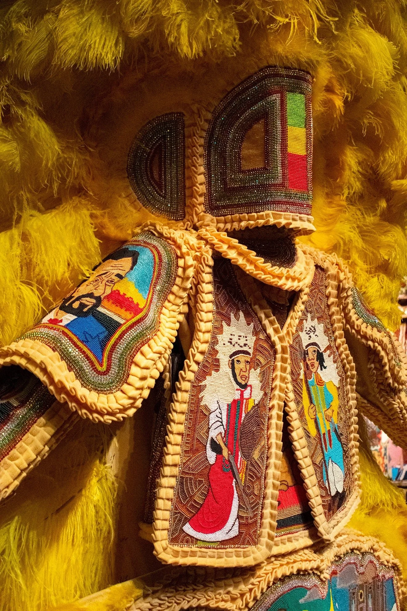 Contemporary artist and educator, Big Chief Demond Melancon of the Young Seminole Hunters, and Assemble collaborated with the V&A to bring Melancon’s huge Mardi Gras Indian suits composed of intricately hand-sewn beadwork to the Tapestries Gallery during the festival. The suits, illustrating actual and imagined events from African and American history, were exhibited in the gallery among rare tapestries from 1425, depicting hunting scenes of boars, bears, swans, otters, deer and falconry.