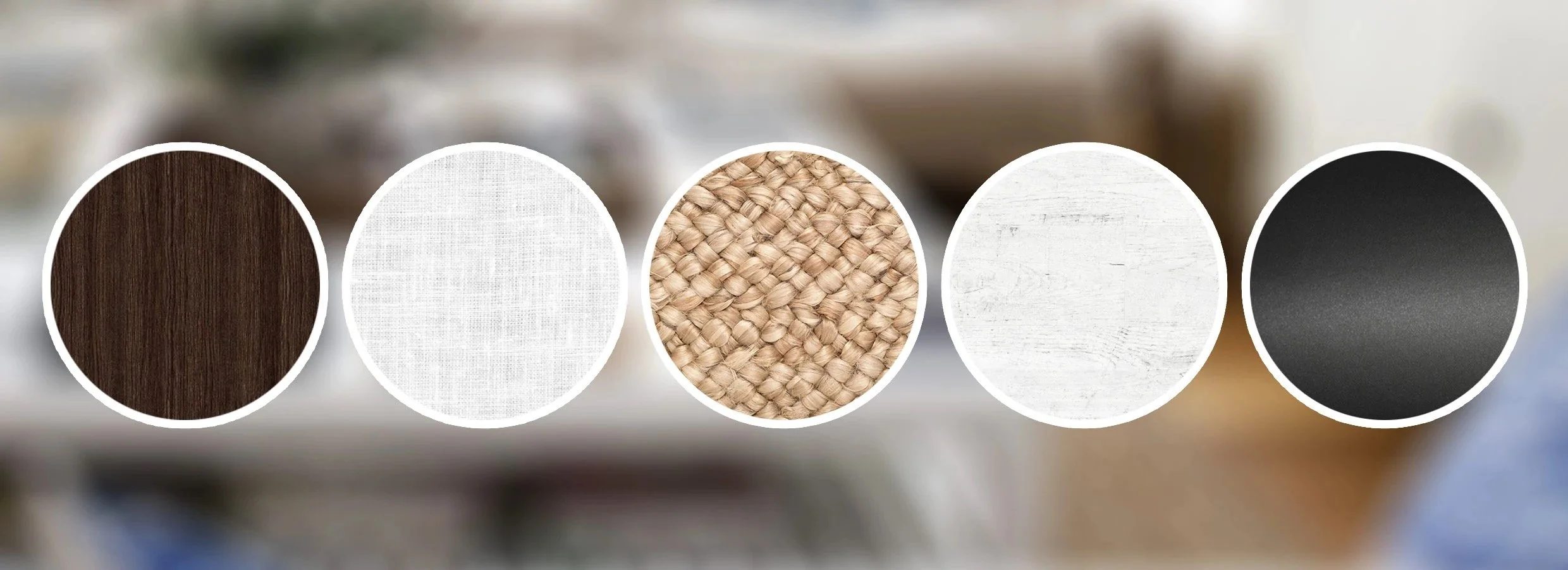 Materials from left to right: dark wood, white linen, woven seagrass, white painted wood weathered, black matt metal finish.