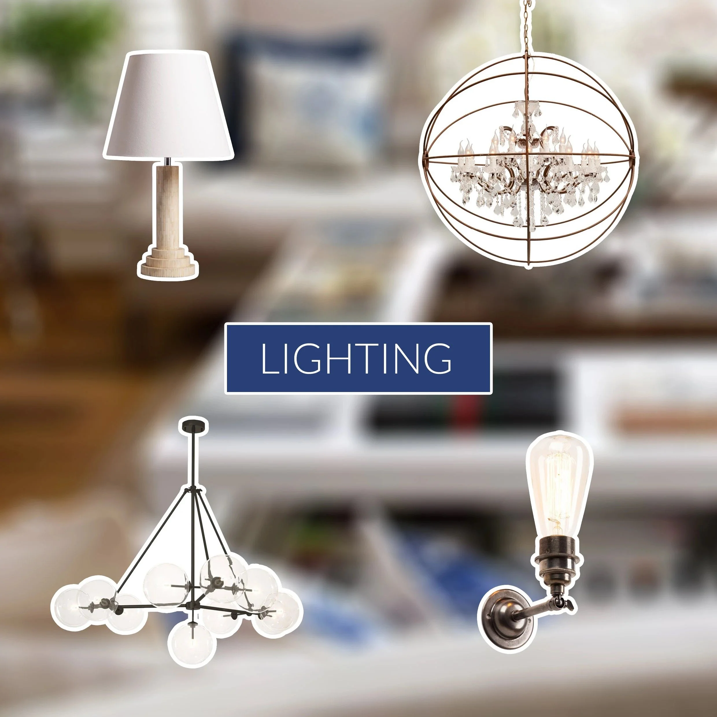 Clockwise from top left: Talisman - Karl Springer attributed tessellated horn table lamp, Timothy Oulton - Gyro crystal chandelier, Old School Electric - Industrial wall light, Eichholtz Chandelier Bermude.