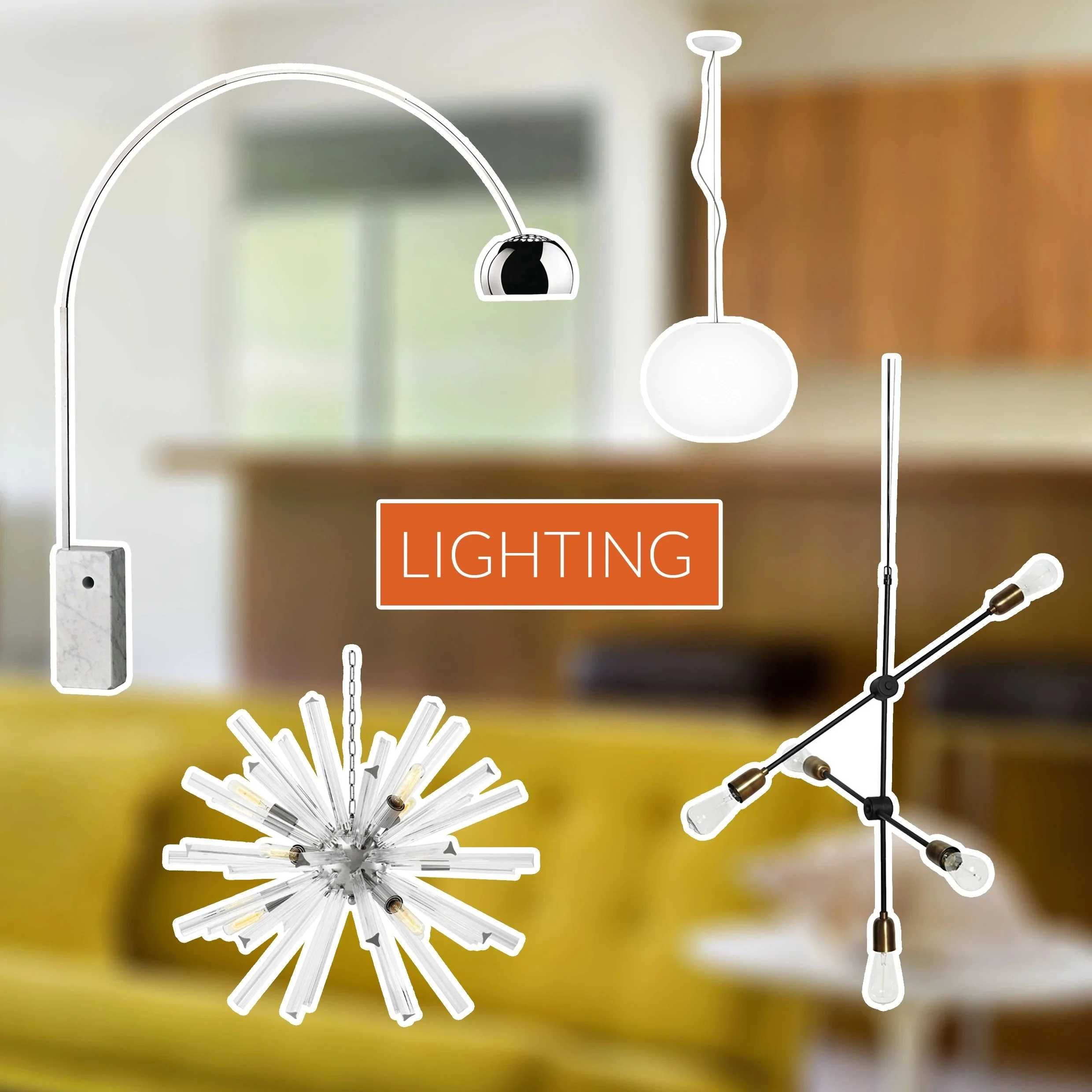 Mid Century Modern Lighting: (clockwise from top left) Heal's: Arco Floor Light by Flos, Flos: Glo-Ball S designed by Jasper Morrison, House Doctor available at Amara: Molecular Ceiling Pendant, Eichholtz: Equalizer Chandelier.