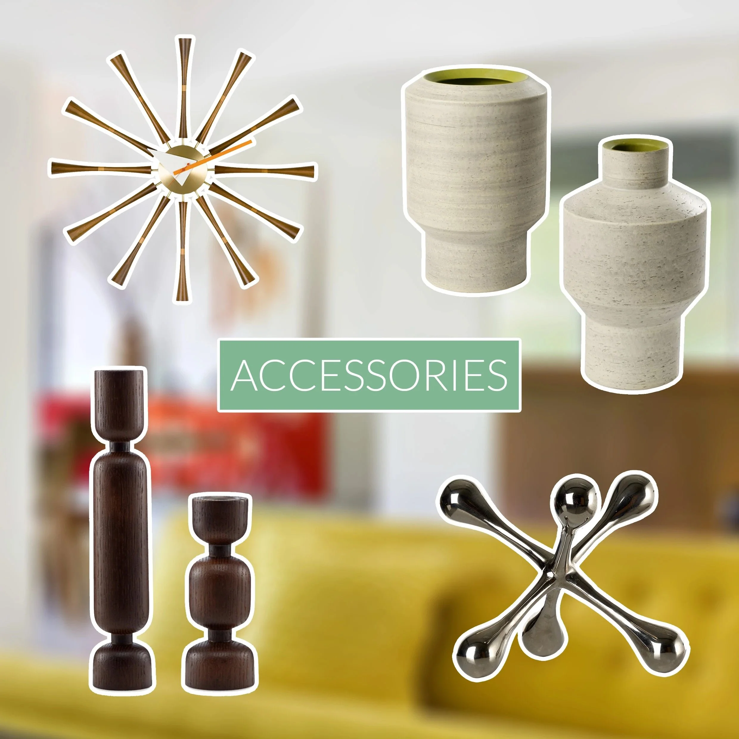 Mid Century Modern Accessories: (clockwise from top left) Vitra: Spindle Clock George Nelson, The Conran Shop: Tribes Vase Medium and Small by Arik Levy, Pols Potten: Fantasia Zilver, Normann Copenhagen: Lumberjack Candleholder stained oak in small and large.