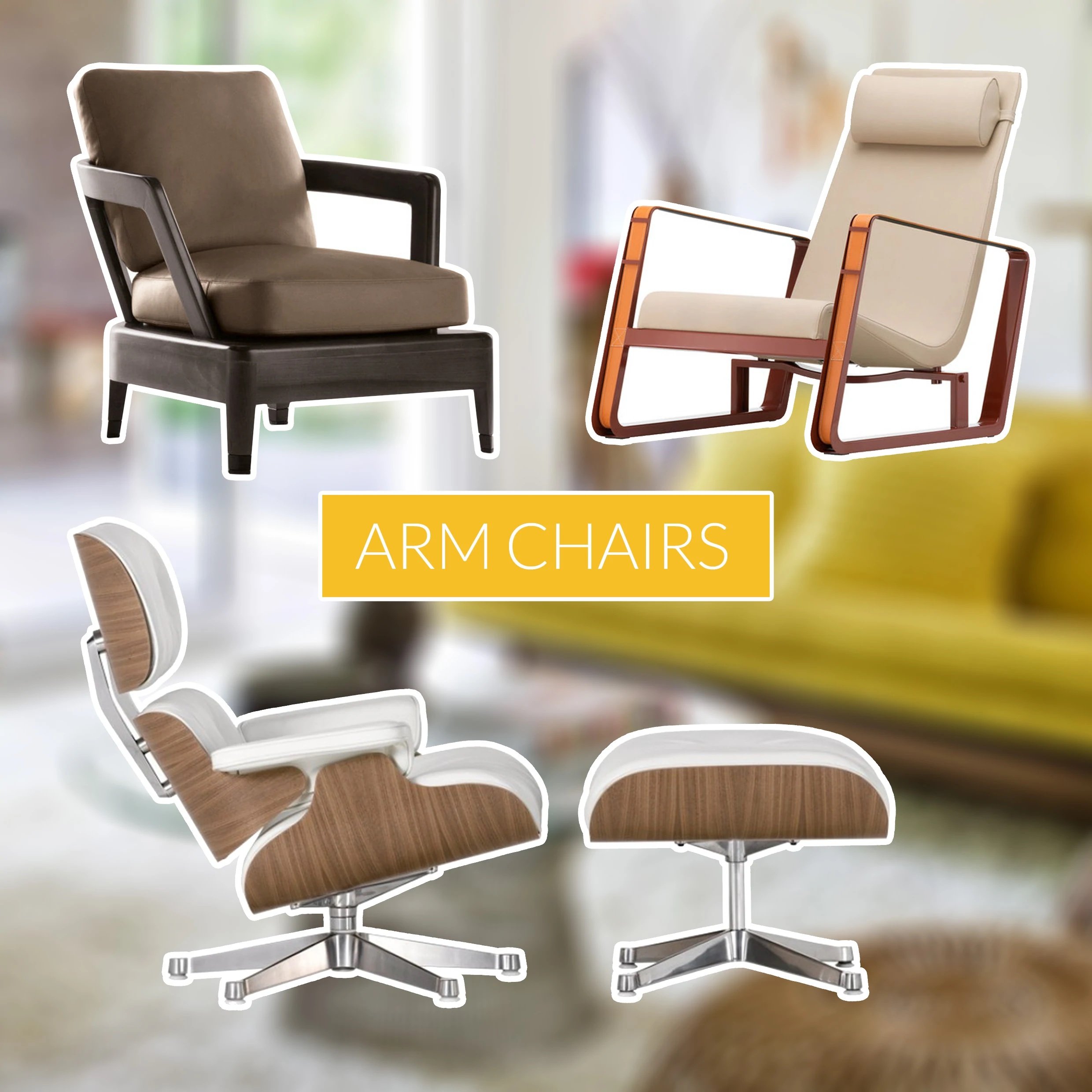 Mid Century Modern Chairs: (clockwise from top left) Minotti: Virginia Indoor Armchair, Vitra: Cité Armchair, The Conran Shop: Classic Eames Lounge Chair & Ottoman.