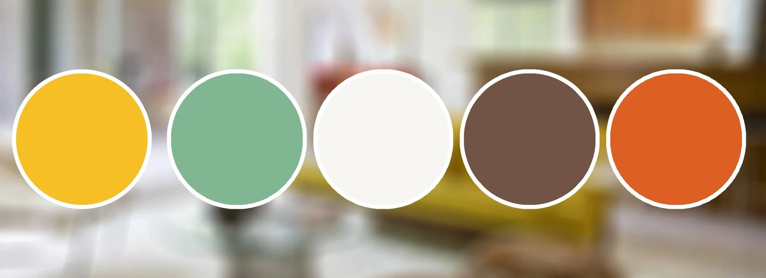 Mid Century Modern Colour Palette: Paint colours feature from the Farrow & Ball range. (from left to right) Babouche No. 223, Arsenic No. 214, All White No. 2005, London Clay No. 244, Charlotte's Locks No. 268.