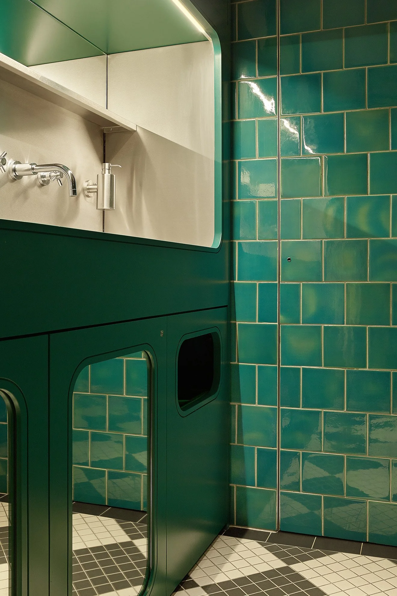 The washrooms continue the vintage style, clad with teal glossy tiles, reminiscent of the almost clinical pantry designs seen inside early 20th-century villas. This is a style that has continuously evolved over time and one that we cannot get enough of. Set within one of the curved corner pantry openings is the washing station with chrome fixtures and fittings.