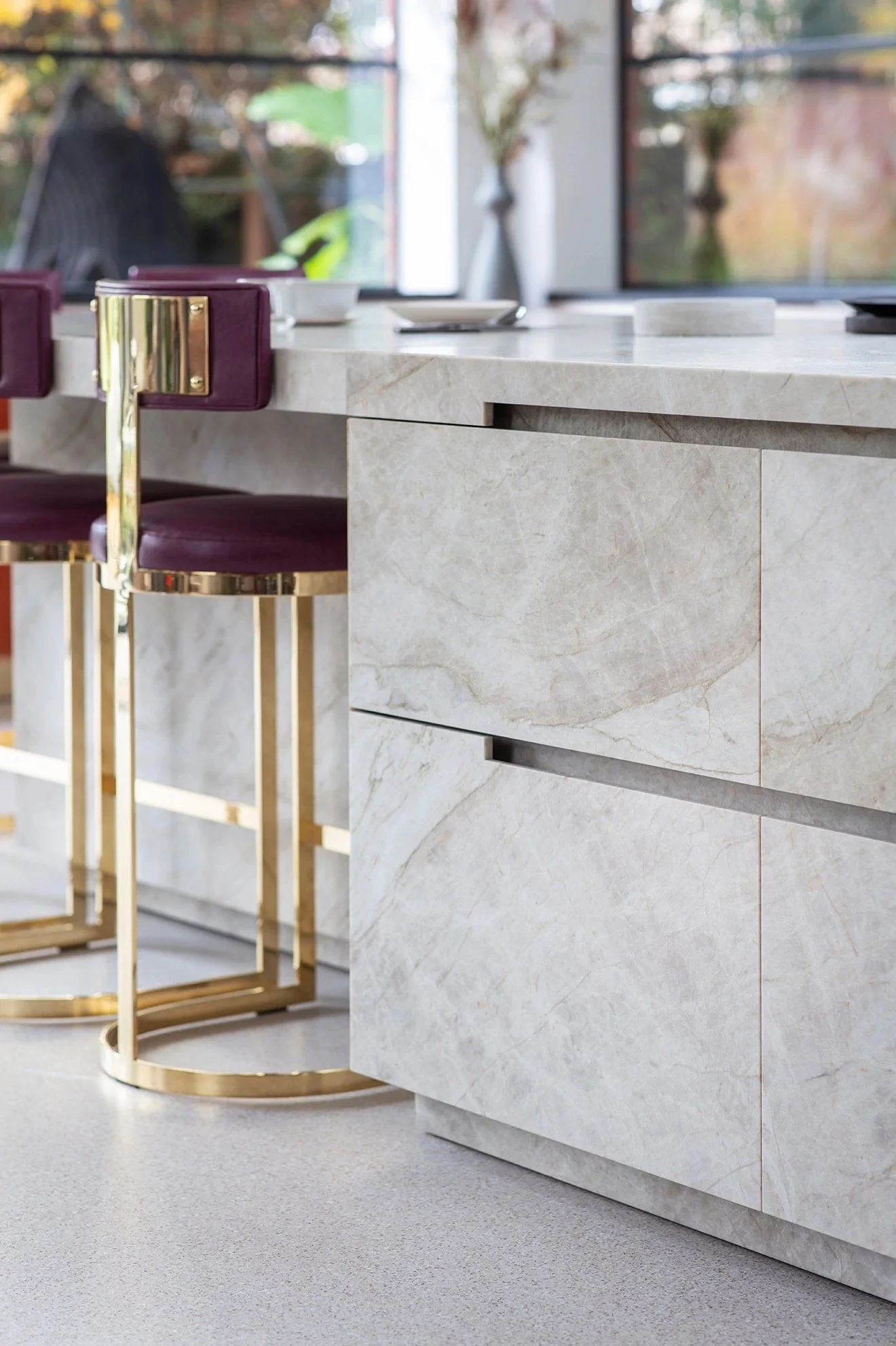 Clad entirely in Taj Mahal quartzite, the island is the centrepiece of the kitchen; an example of the precise engineering and exquisite craftsmanship required for the project with the solid quartzite of the drawer fronts painstakingly cut into slabs just 11mm-thick. The surrounding cabinetry takes on a darker tone, finished in a contrasting dark grey pigmented concrete, hand-trowelled to build up layers in a similar process to plastering. The exquisite finish produces a unique character, capturing light to add a greater depth and texture in comparison to standard smooth surfaces. Walnut wood introduces a warmer tone through the cut-outs, drawers and shelving. This luxurious material transitions through the extended interior space, used in the construction of the shelving unit, panelling and furniture in the dining and living spaces opposite.