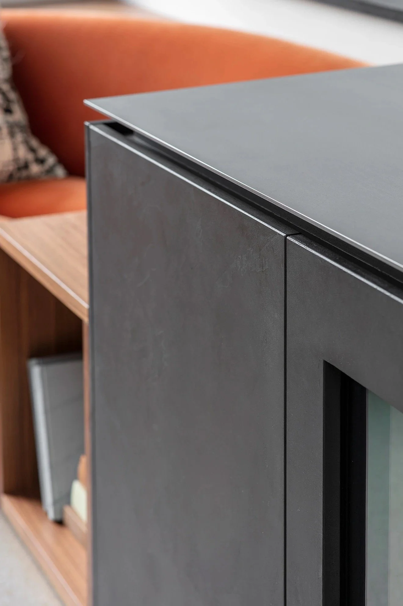 Hot rolled steel is used for the outer worksurfaces, featuring an integrated double sink, expertly welded with a seamless join. The fine texture of the work surface limits any visibility of fingerprints and scratches, and while many of the appliances remain concealed from sight, the ones on display are presented flush to the cabinetry, ensuring that the clean lines and luxurious materials of the kitchen remain the prominent design aesthetic.