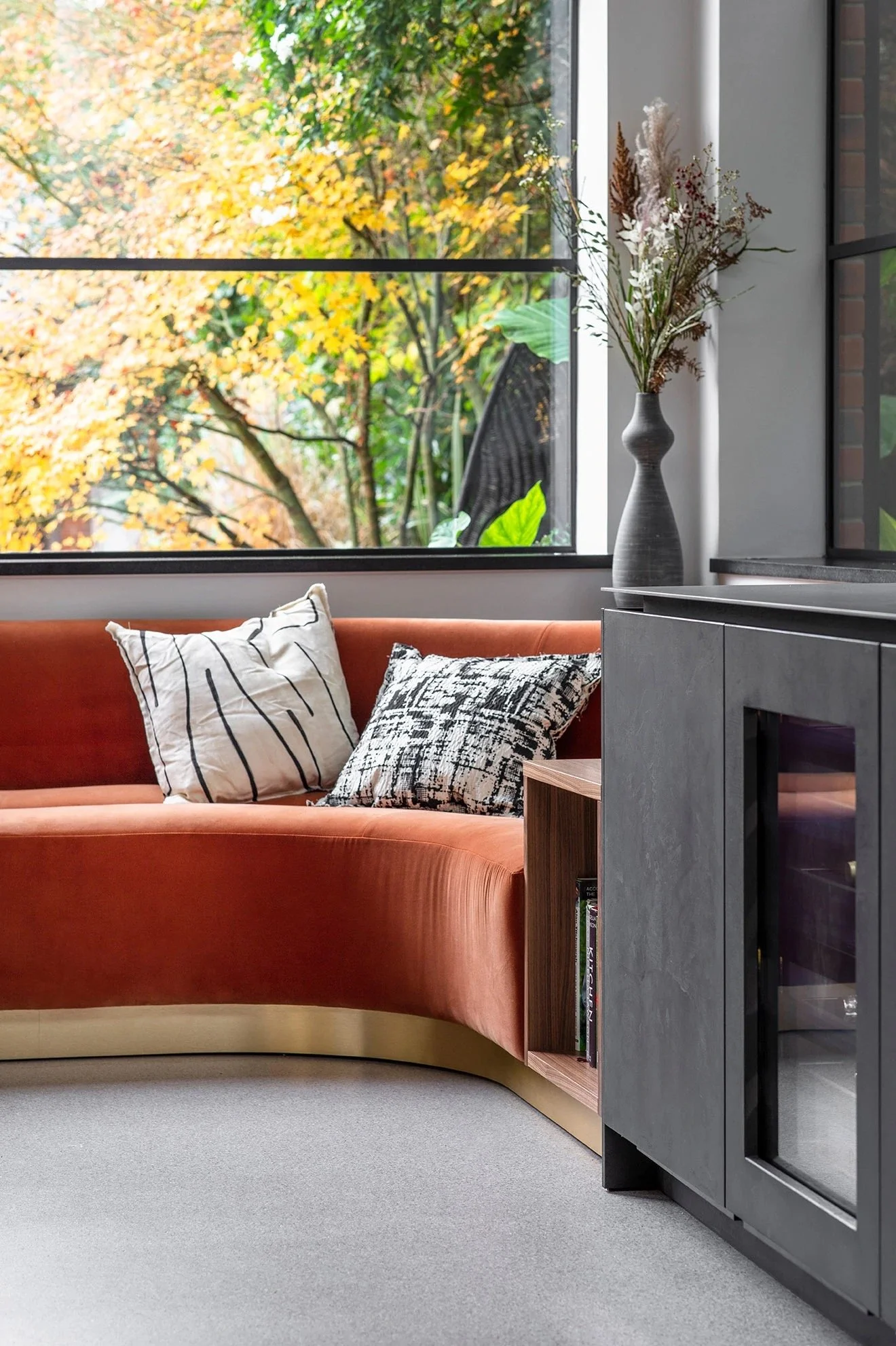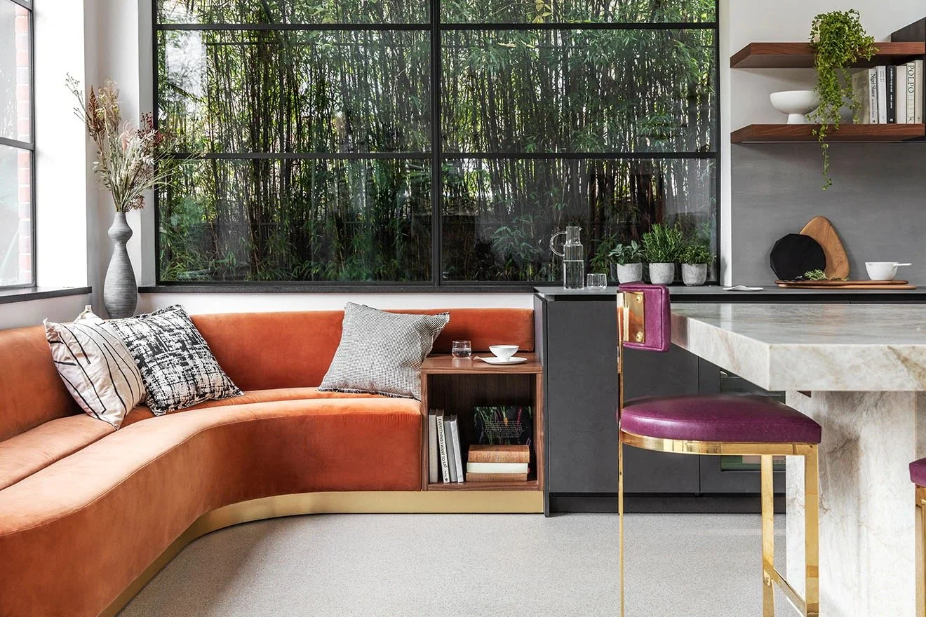 Vibrant pops of orange and purple hues inject colour into the interior through the velvet and leather upholstery. The adjacent lounge seating provides the perfect social space for guests to sit and chat with those preparing food in the kitchen. The curved form softens the edges of the interior, breaking up the straight lines and grid-like layout of the units. The brass metalwork of the baseboard echoes through the interior, seen in the barstools at the breakfast bar and the pendant lighting suspended above the kitchen island, creating balance to the design.