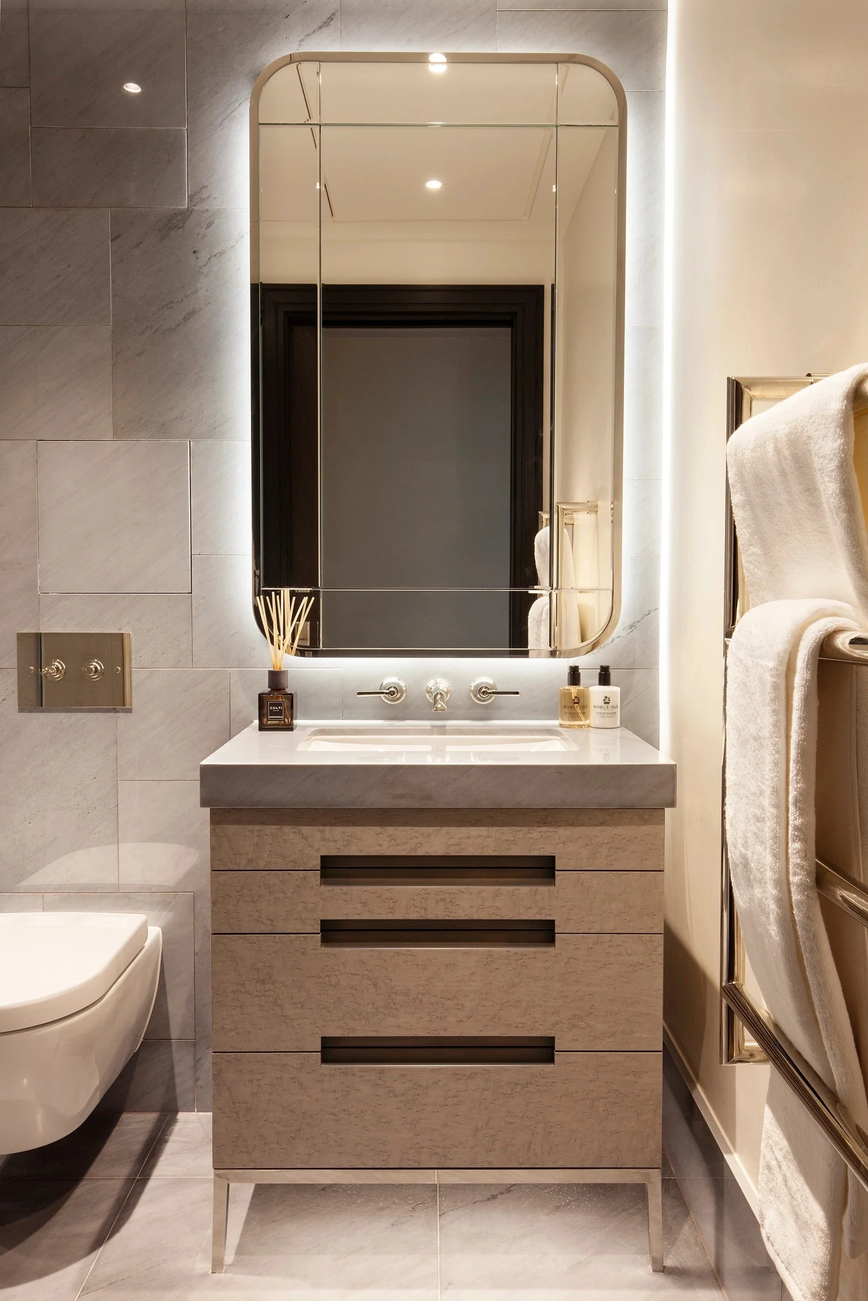 A place of tranquillity - the washroom exhibits a muted colour palette with soft grey tilework, matching sink countertop and ivory painted walls. The sizeable polished chrome mirror with its curved corners softens the lines of the interior, reflecting the warm lighting and ivory hues to create an effortlessly beautiful and luxurious space. Texture plays a crucial part in the design of the bedrooms, introducing layers of comfort and style within these relaxing retreats. Plush grey carpeting creates a sense of intimacy in the rooms, and the large upholstered headboards create a central focus for the interiors, luring the eyes in towards the layering of beautiful textiles and patterned cushions, complemented by opulent lighting and soft furnishings.