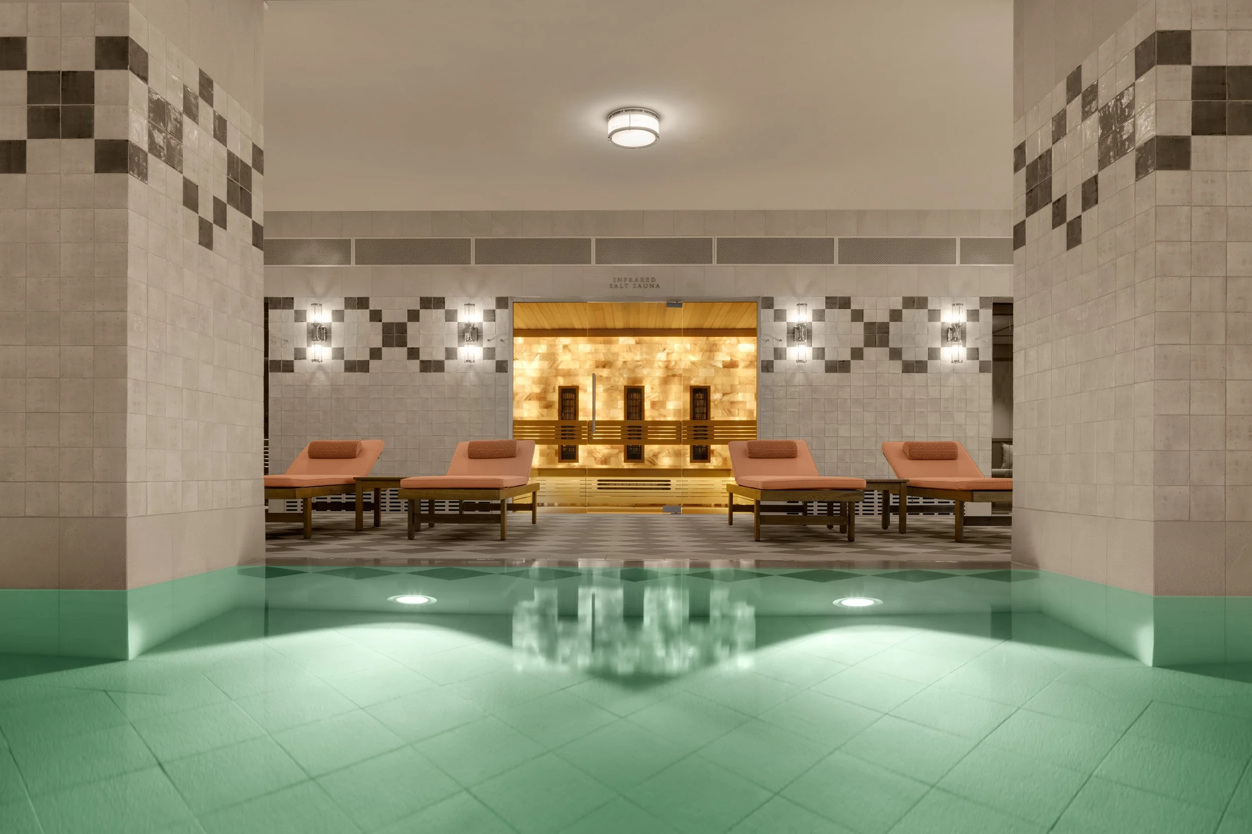 The design draws on Poland’s salt-mining heritage, but interprets it in a contemporary way. Surfaces are softened, acoustics are dampened, and light is carefully controlled. The 20-metre pool becomes the centrepiece, its length emphasised by clean lines and a restrained material palette.