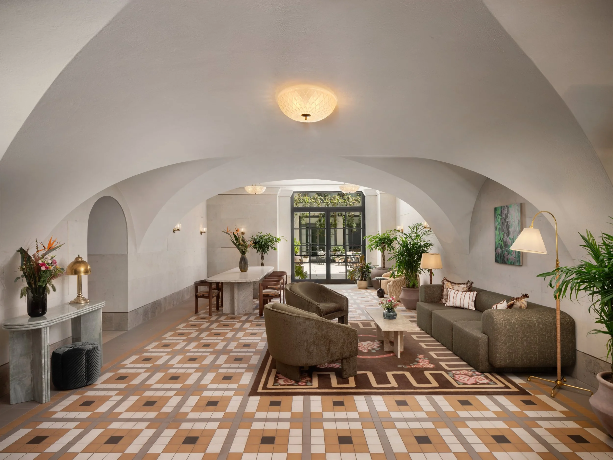 The design, led by London-based ADC Atelier, leans into contrast without ever feeling forced. Raw stone walls meet soft, tactile upholstery; aged surfaces sit alongside refined, almost residential furnishings. Lighting is deliberately low and atmospheric, drawing attention to texture rather than spectacle. It feels less like a hotel reception and more like an antechamber; an introduction to the building’s past, reframed for modern living.