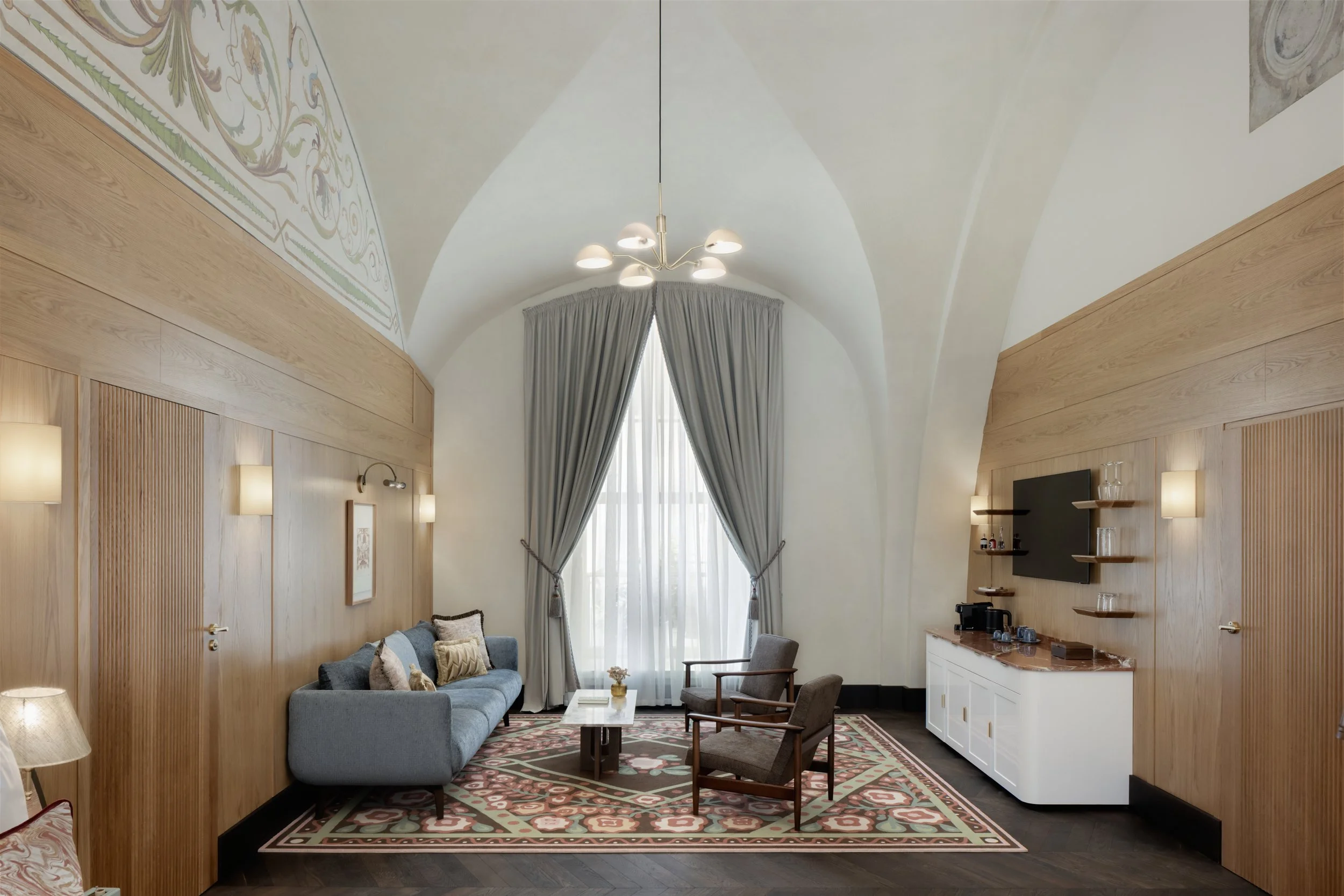 In the heritage rooms and suites, original architectural elements are allowed to remain visible, subtle irregularities, traces of age, moments that remind you of the building’s former life. These are balanced with contemporary furnishings and a restrained palette, ensuring comfort without erasing character.