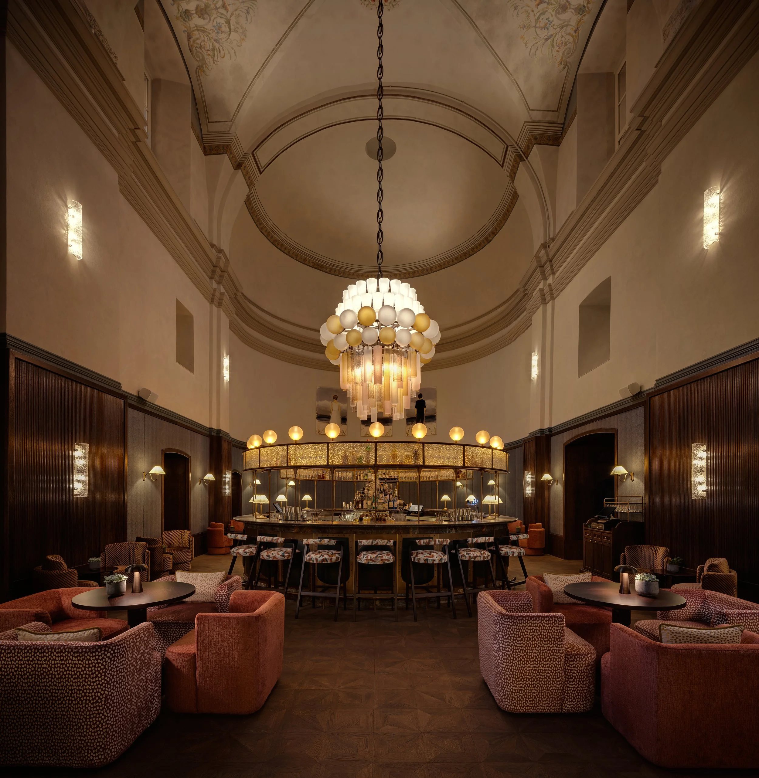 Perhaps the most striking transformation at Stradom House is Hedwig’s Club, housed in a restored Baroque chapel. It is here that the dialogue between old and new becomes most pronounced.